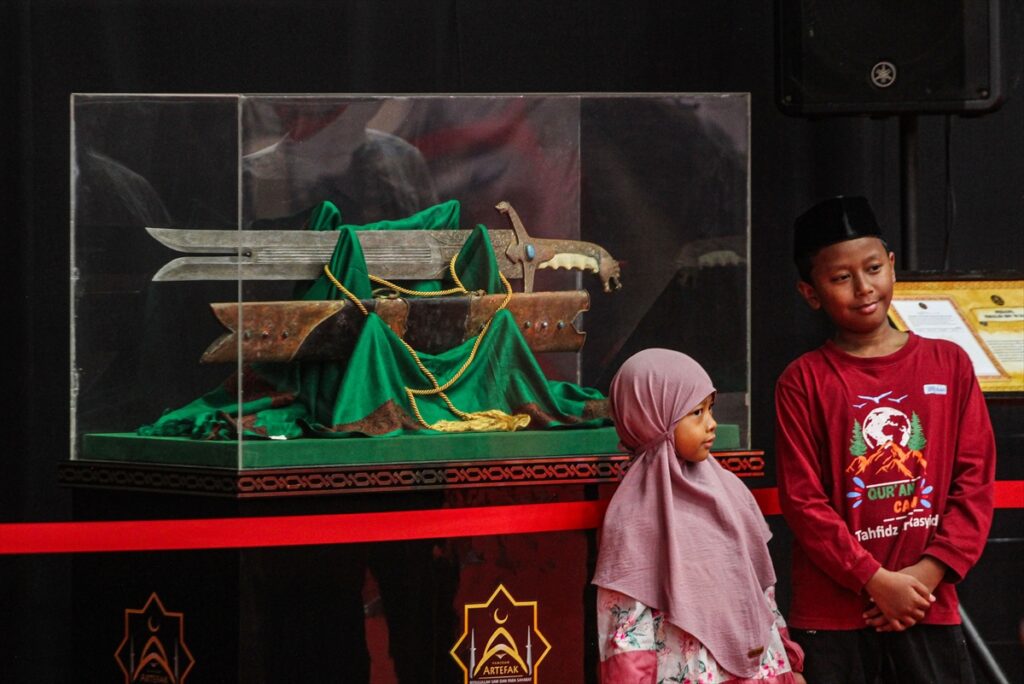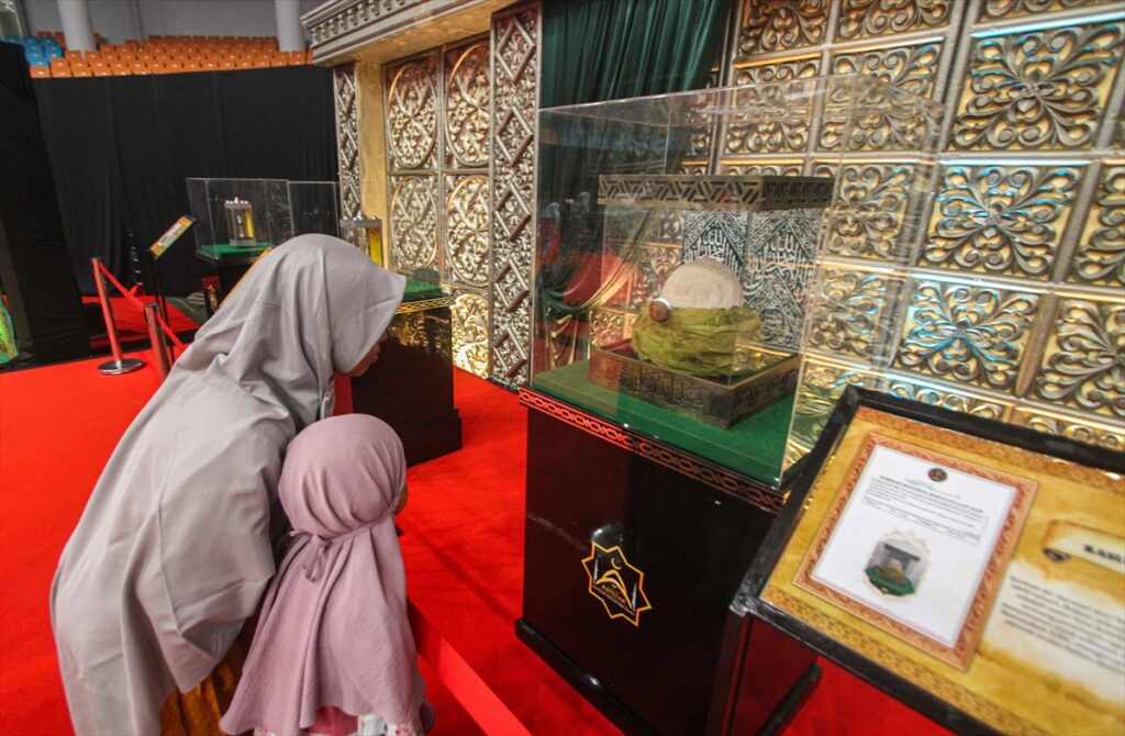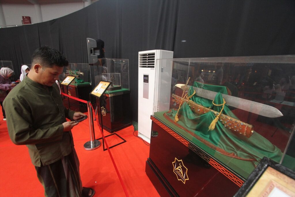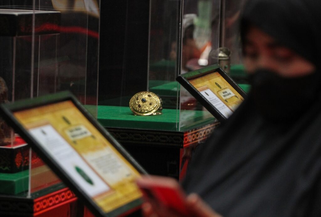 Posjetioci posmatraju artefakte iz vremena poslanika Muhammeda a.s. izložene na izložbi artefakata Poslanika s.a.v.s. i njegovih ashaba u zgradi Laga Satria u Pakansariju, Bogor Regency, Zapadna Java, Indonezija, 21. februara 2026. Izložba prikazuje 45 relikvija poslanika Muhameda a.s. i njegovih ashaba, od ratne opreme, štapova do Poslanikove s.a.v.s. brade i kose, a cilj joj je da posluži kao historijsko-edukativna tura tokom ramazana.