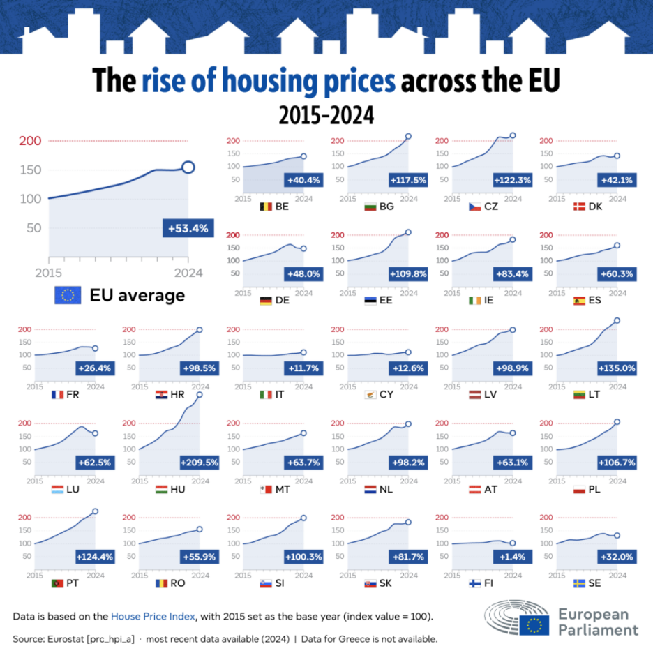 Između 2015. i 2024. godine, cijene kuća u EU su u prosjeku porasle za 53%. Najveći porasti zabilježeni su u Mađarskoj (+209,5%), Litvaniji (+135%) i Portugalu (+124,4%).